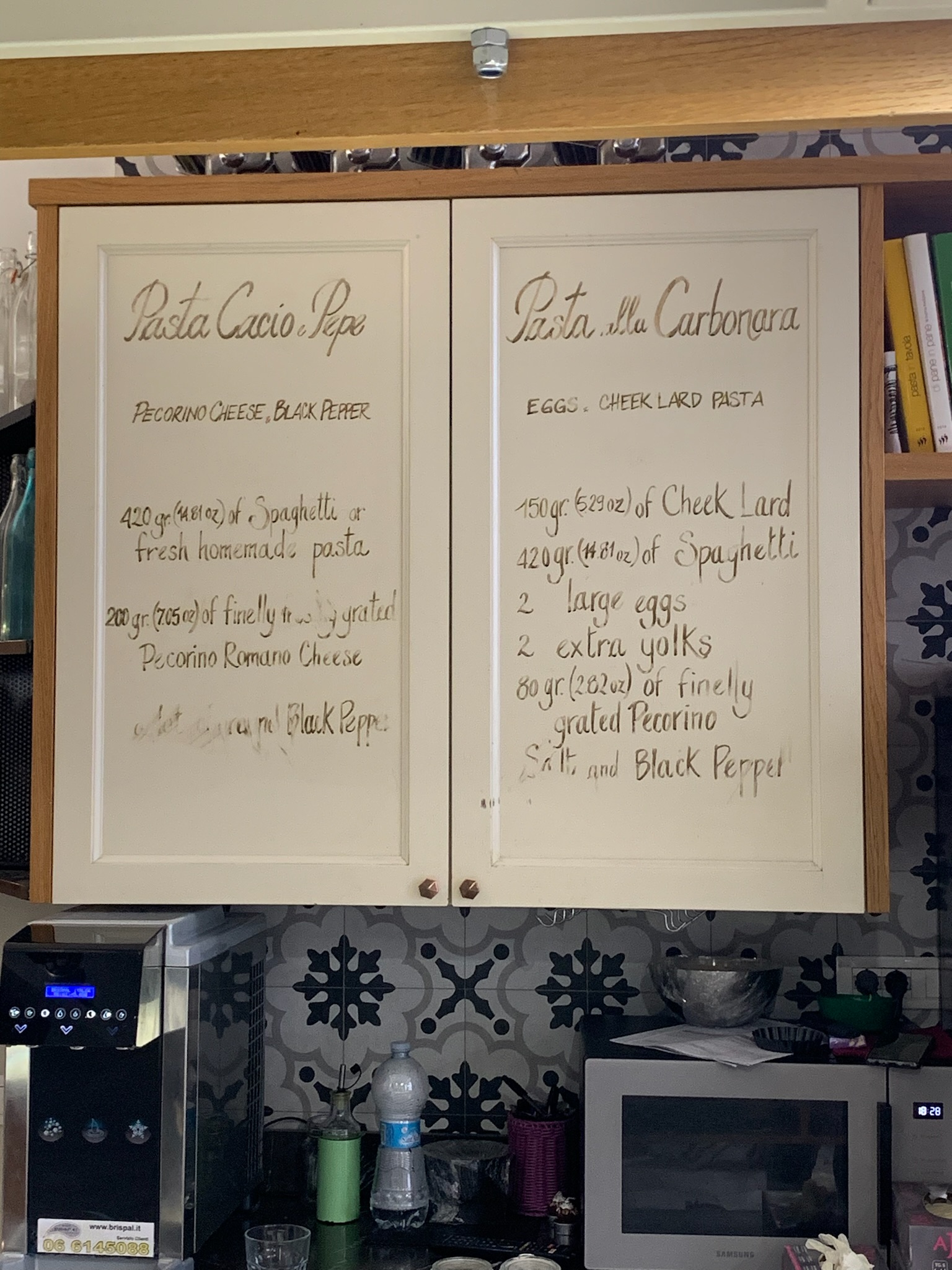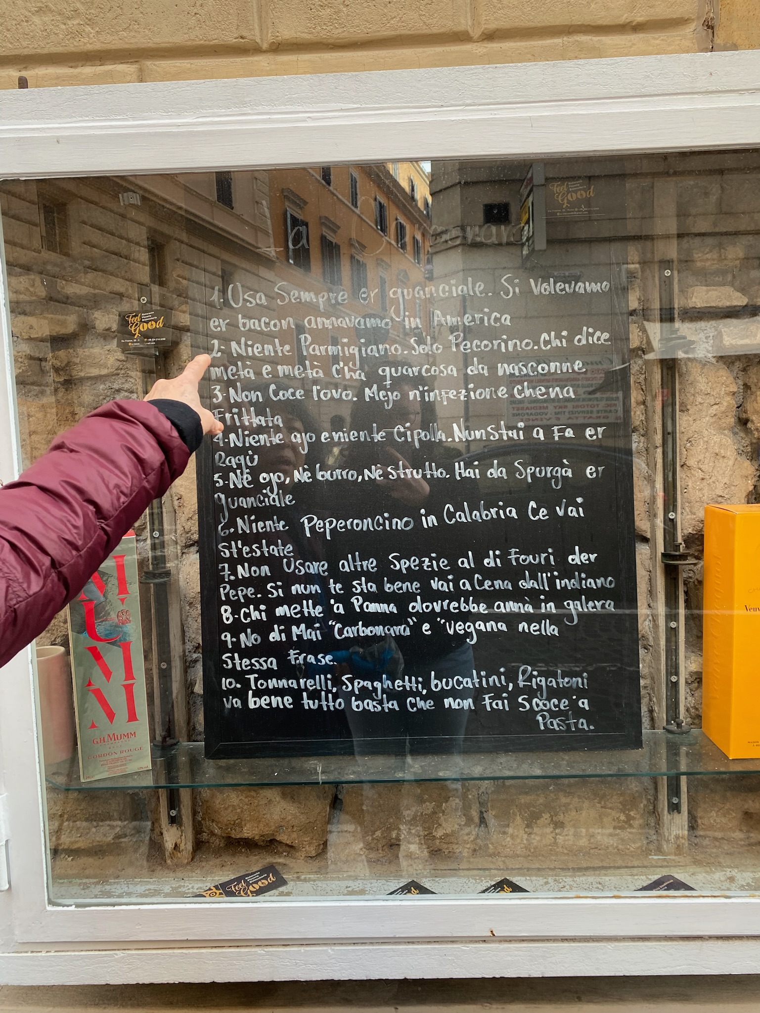 The above was near Apartamento Secondo. It sets out rules for making the classic Roman pasta dish, carbonara. It’s got a bit of slang and Roman dialect but generally translates as: