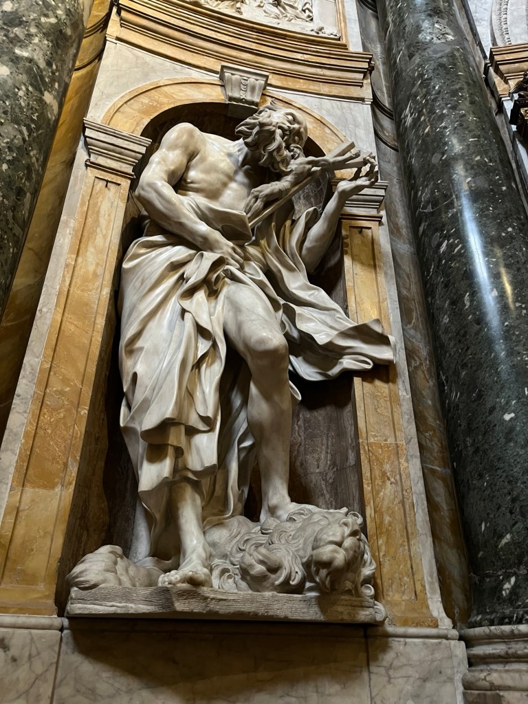 Wikipedia says these were designed by Bernini but executed by his workshop. That sounds right to me. St Jerome and his lion look less like they were carved by a genius than, for example, the Pluto and Persephone in the Borghese in Rome.