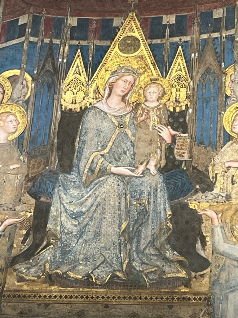 I did look at Simone Martini’s Madonna Maestà. I never noticed the sparkly bits around Mary in depictions I had seen. They look like white blobs in the photo but seemed to be glass or something clear and reflective.