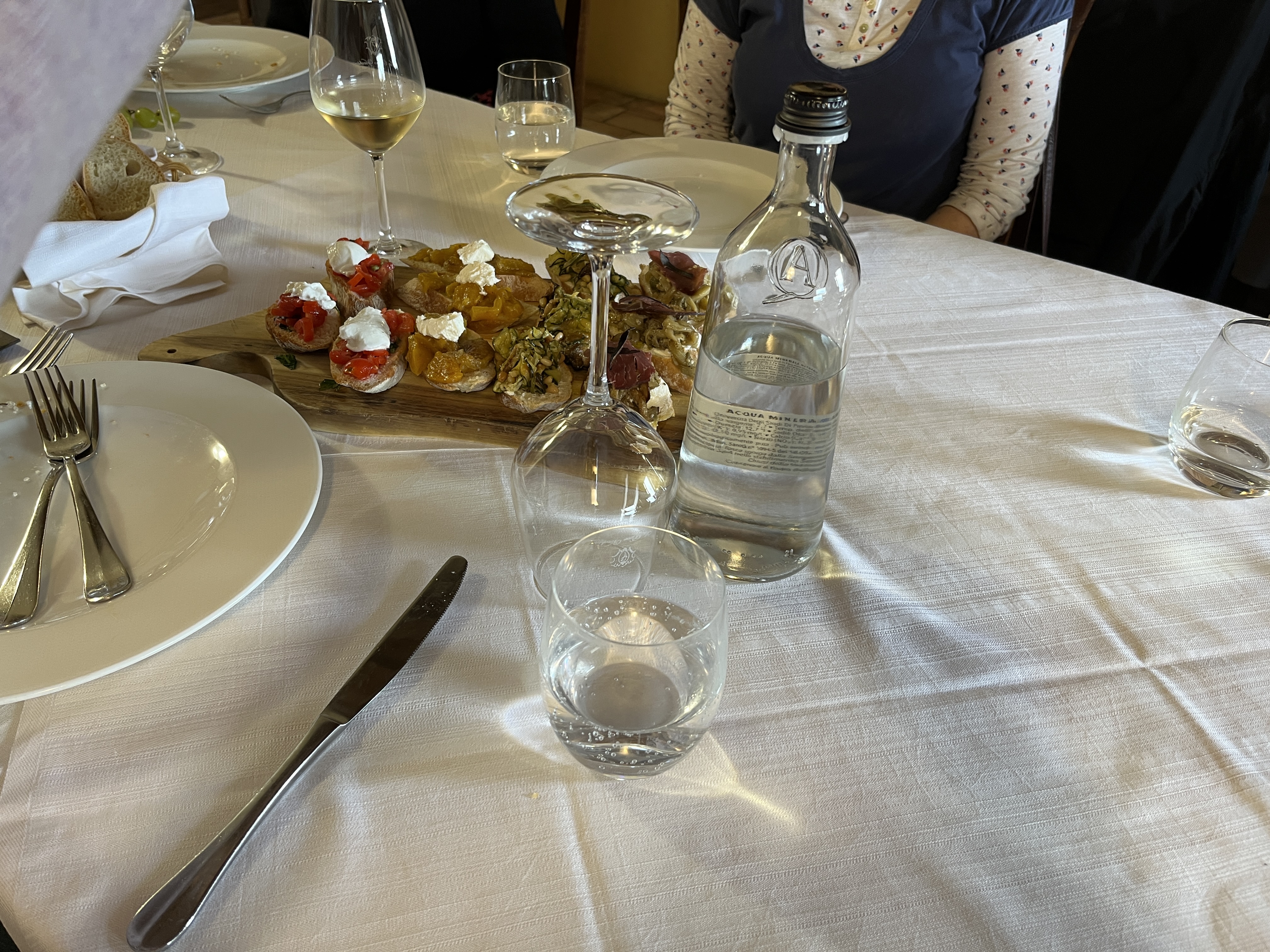 Above, bruschette followed by a ravioli and beef stew with patate frite (fries).