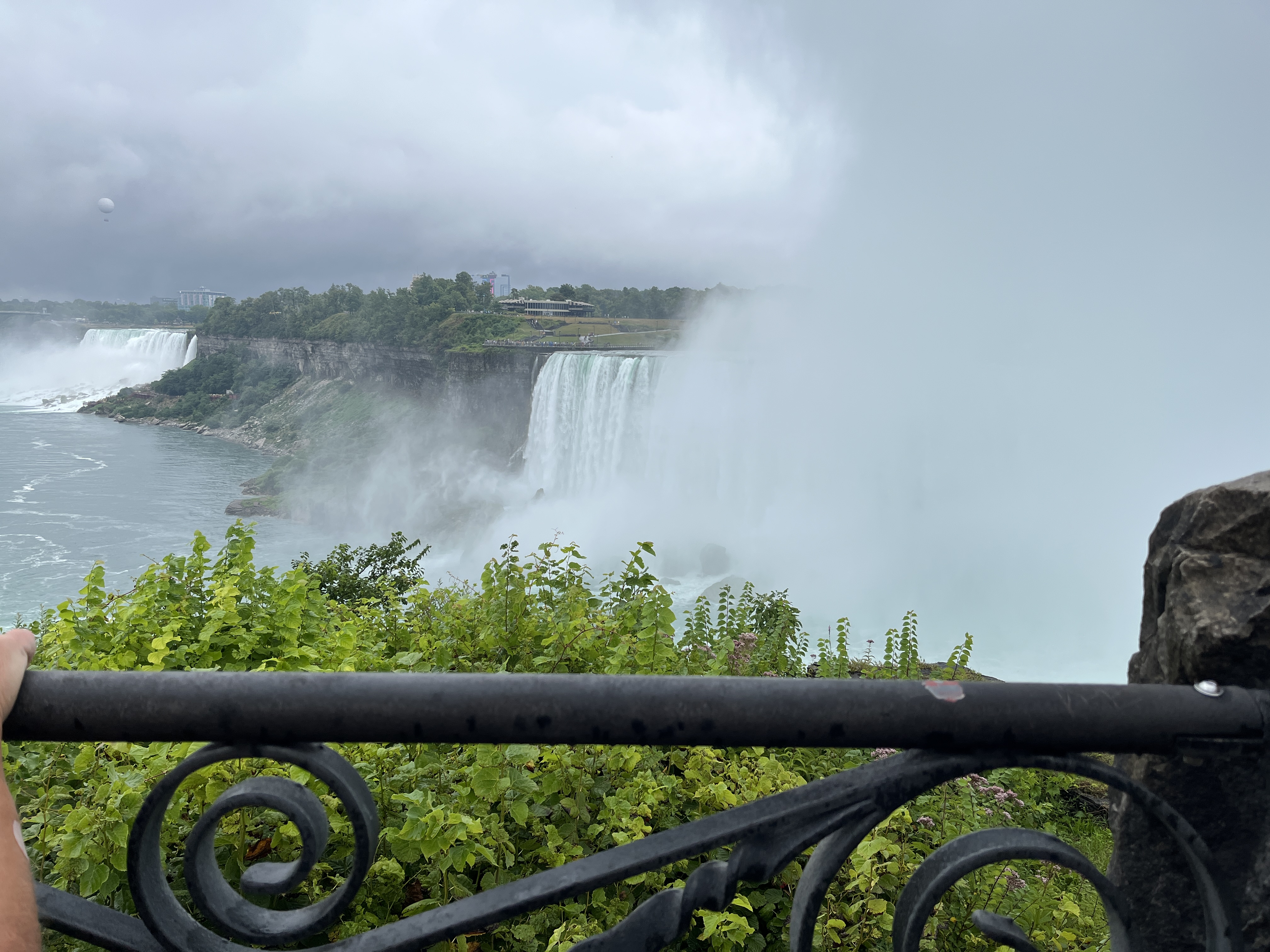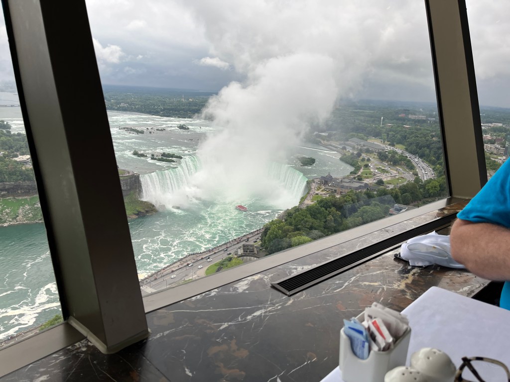 The rain probably kept the tourist crowds not too large. We skipped getting a boat tour — I get seasick — and had lunch at the Skylon Tower.
