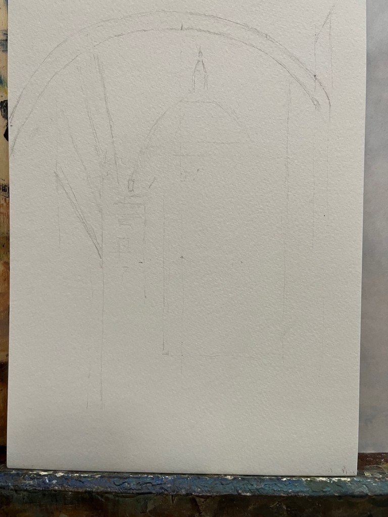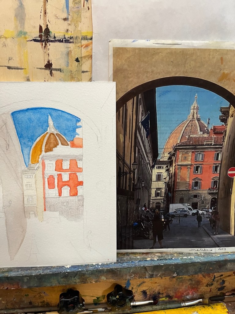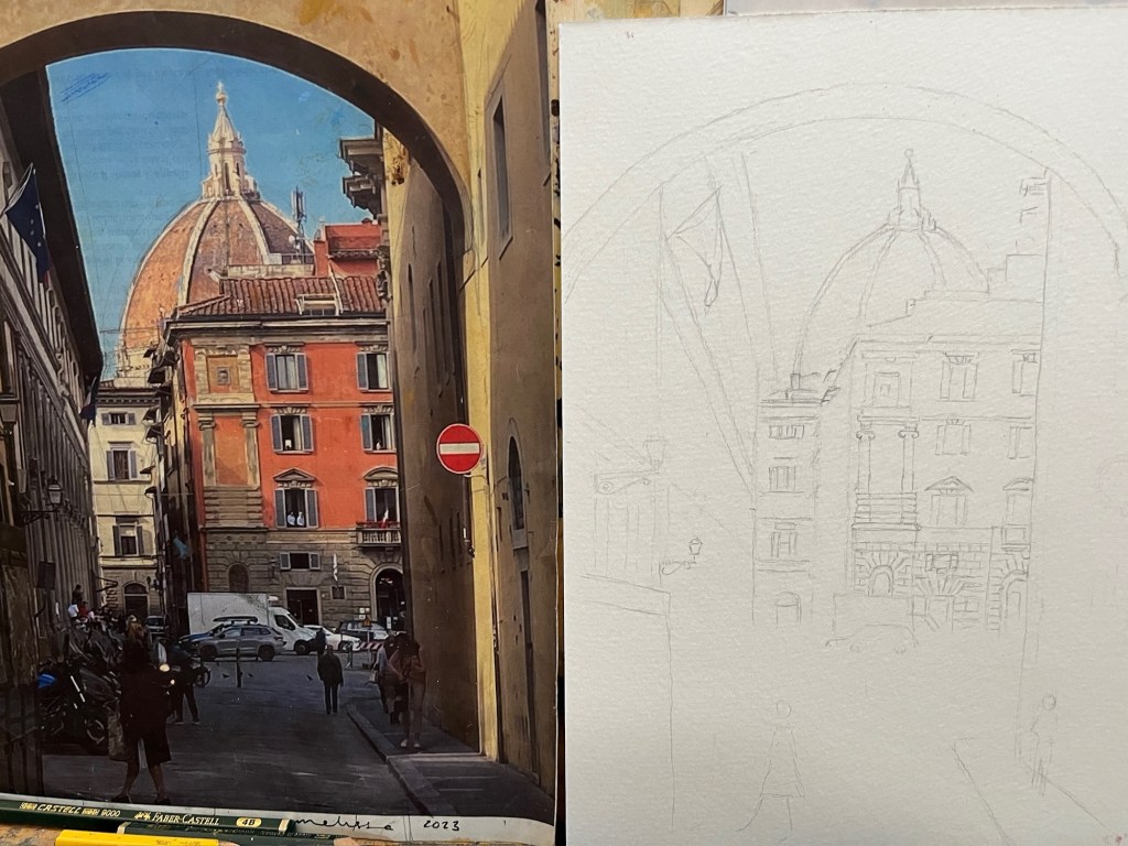 I then started a Duomo view from Santissima Annunziata, where we went to on Tuesday last week but this view is from a more extreme angle. I spent an hour and a half but gave up trying to correct the disproportions on this try.