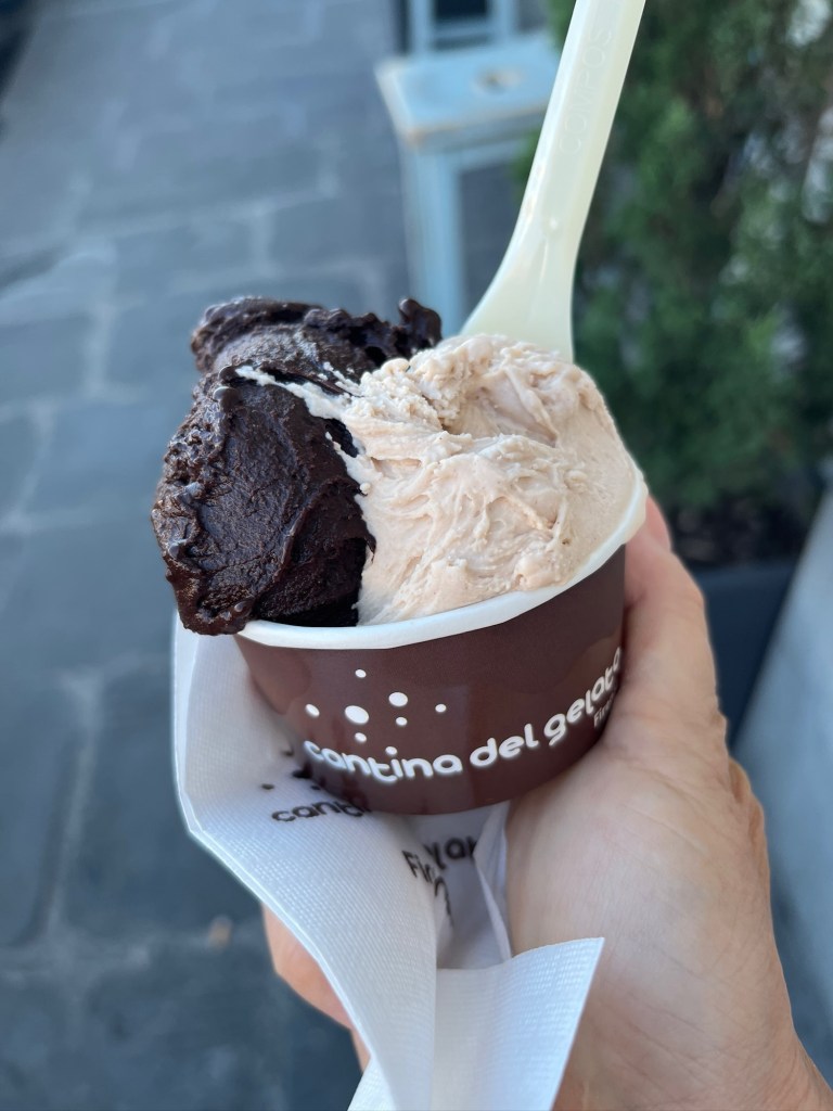 For my second stop, I tried La Cantina del Gelato. The cioccolato was very intense chocolate flavour but I didn’t taste like it had any milk product in it. I liked it but it tasted more like a chocolate bar than gelato. The nocciola was not a strong hazelnut flavour, maybe because the cioccolato was so powerful; it was good, although not in the top tier.