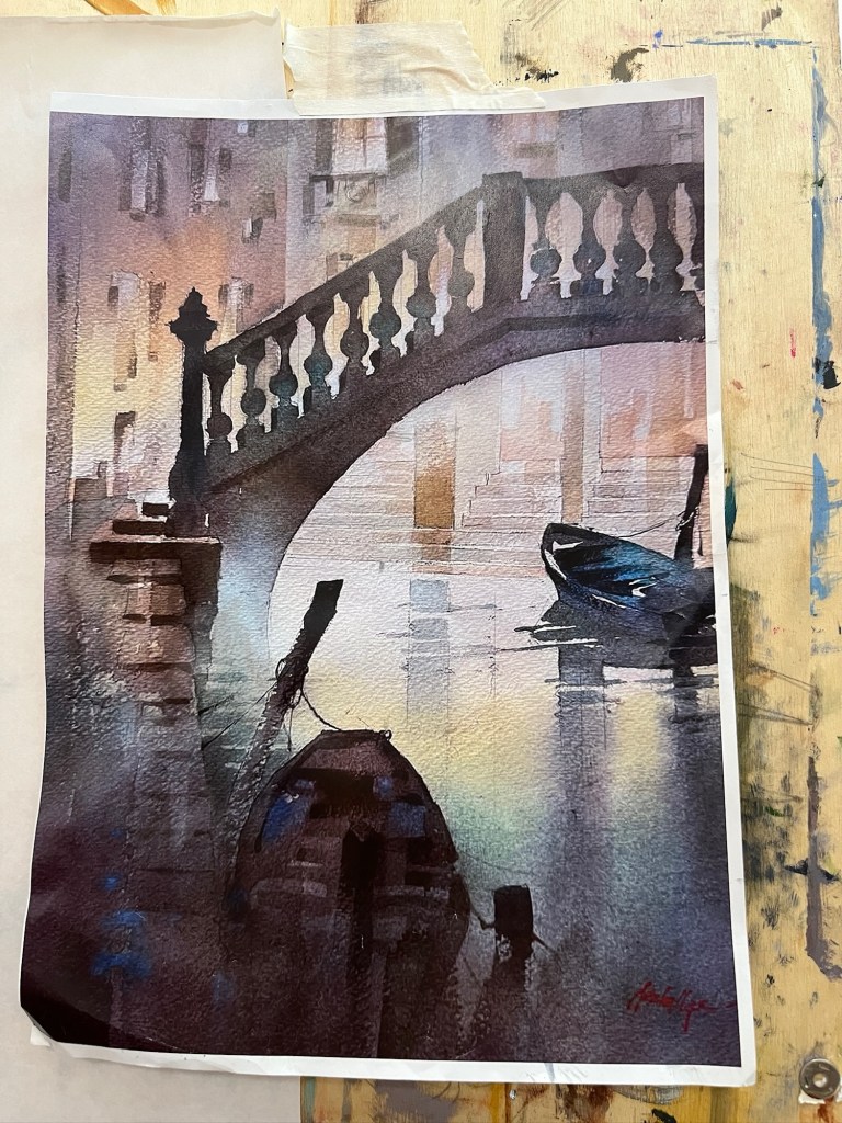 I originally sketched in some people but decided to paint over them. This exercise took a while since I needed to let the paint dry between adding glazing layers.