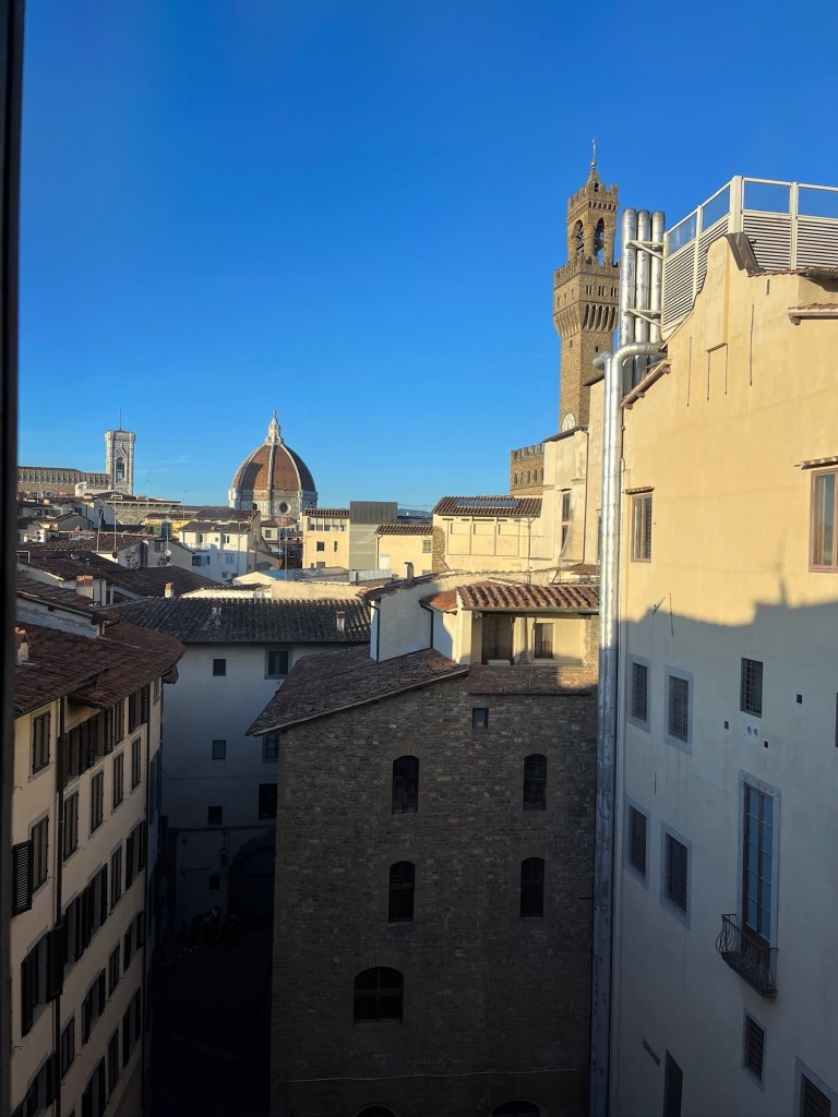 Uffizi closes at 6:30 pm most days. Going in at 5 seemed to be a fairly good time to avoid huge crowds. Good views out the window this day.