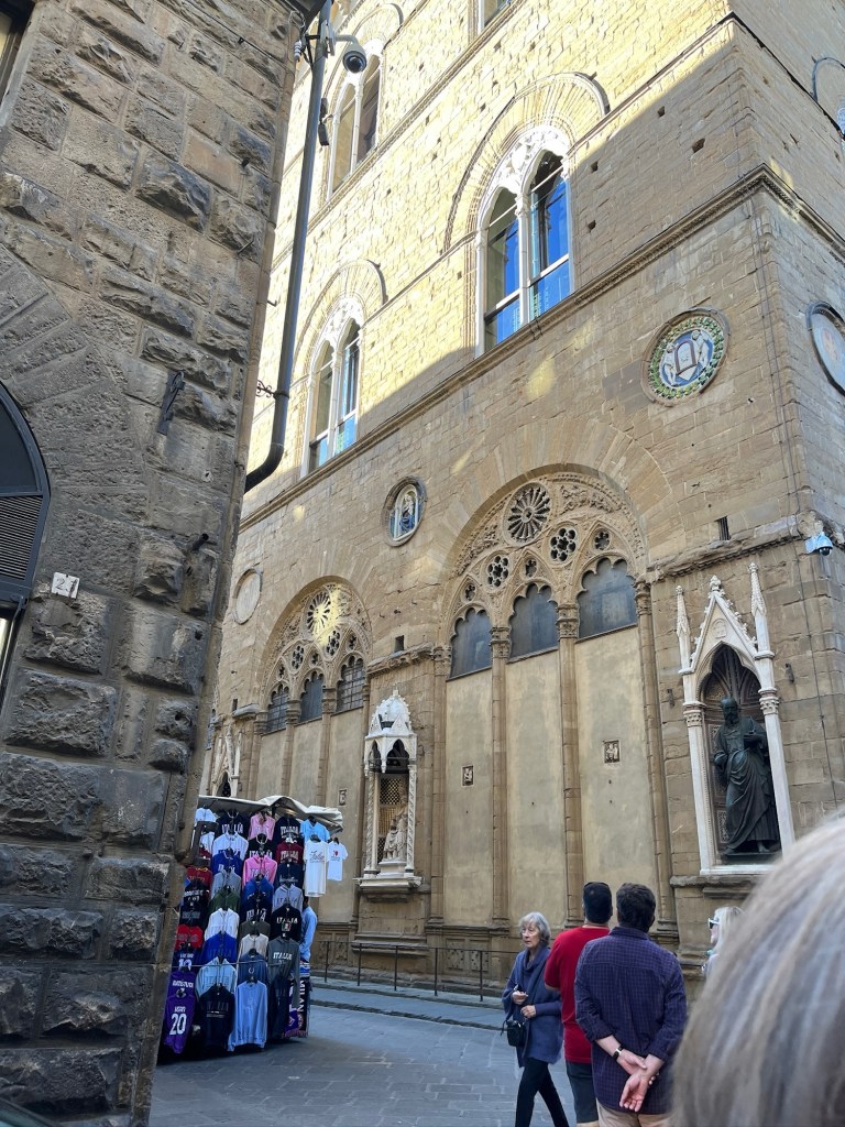 After a bite of lunch (pasta with tomato and pesto), we went for a walk to discuss the layout of Florence’s former Roman origins and the significance of Orsan Michele. In particular, the economic success and status shown by the guilds commissioning statues from artists who were geniuses: Ghiberti, Donatello, Verrocchio and others. The statues reflect the “rediscovery” of classical (ancient Greek and Roman) style. The origins of the Renaissance can all be found in Orsan Michele.