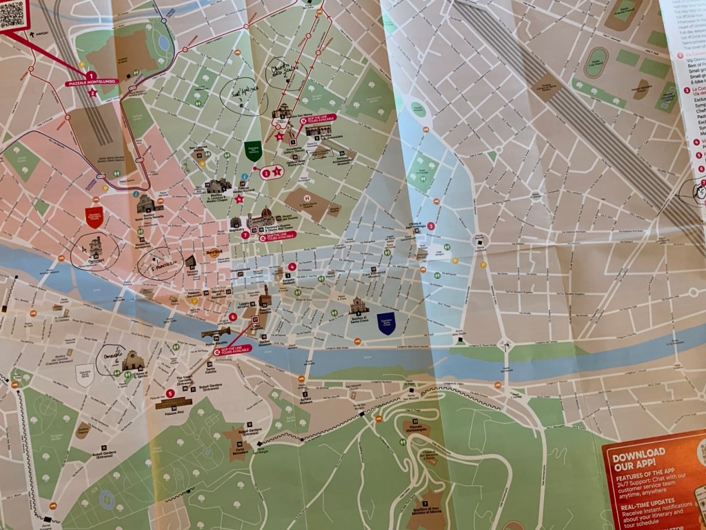 I listed the seven things I most want but have not yet seen in Florence and marked them on a map. Most have limited hours when they are open and the information on the internet is inconsistent. One site is a 45-minute walk (according to Google maps) and it not even on the map. I’m in class until 12:30 Mondays to Fridays, I have only one weekend solo without plans. (I may leave a class or two early :-))