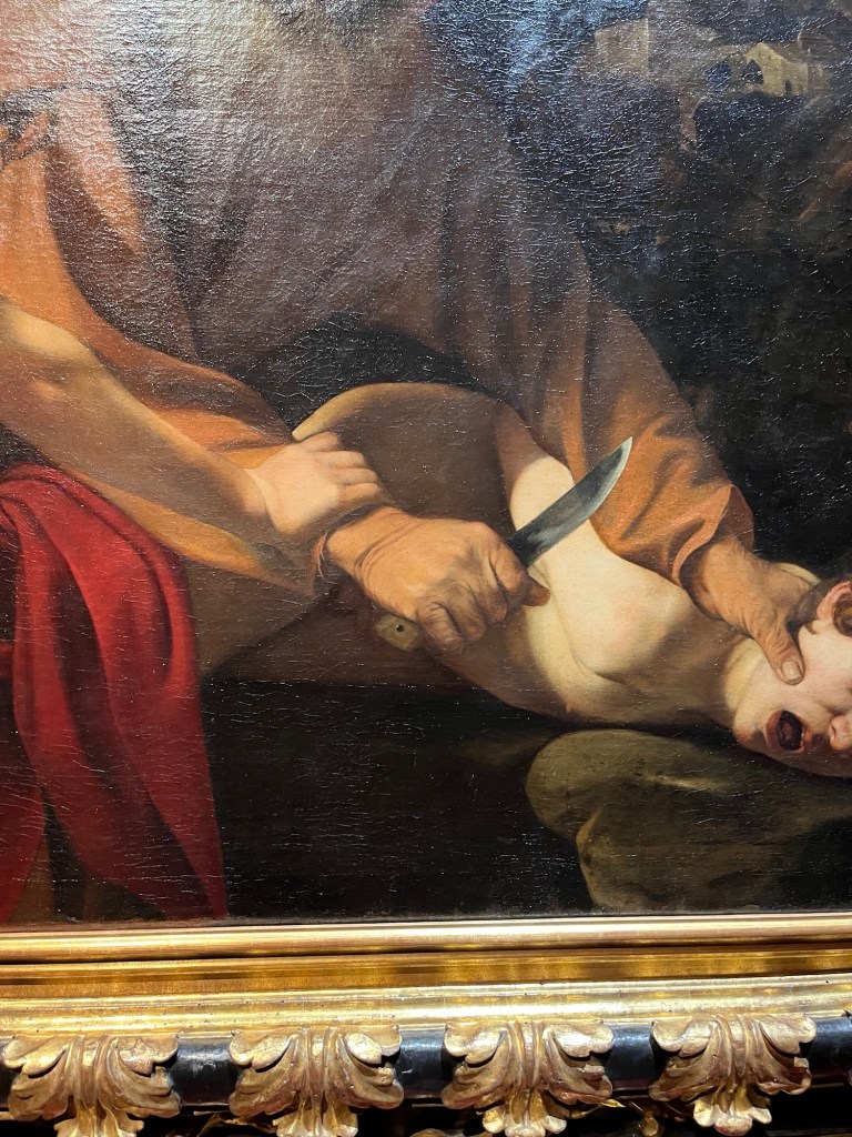 I looked at Caravaggio’s Sacrifice of Isaac and noticed the area by Isaac’s arm, under the sleeve of Abraham and above the angel’s hand, is unclear. What was I looking at? Isaac’s back? His clothes?