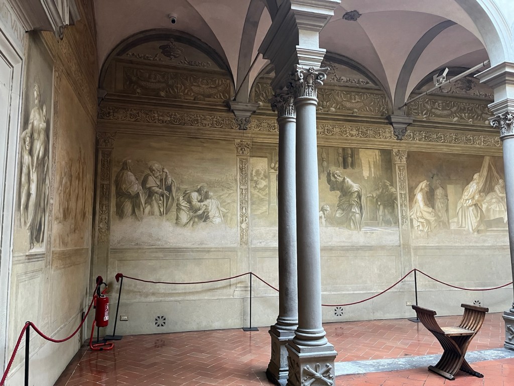 Only the cloister remains. The rest of the church was destroyed in the late 18th century. The cloister was preserved because Andrea del Sarto, who was a member of the Compagnia, painted the walls with scenes from the life of Saint John the Baptist. He painted them over three periods from 1509 to 1526. Thus they reflect the development of his style which starts as Renaissance then shows the influence of Michelangelo and mannerism. They are in grisaille, monochrome grey, which was often used to look like statues or carved marble.