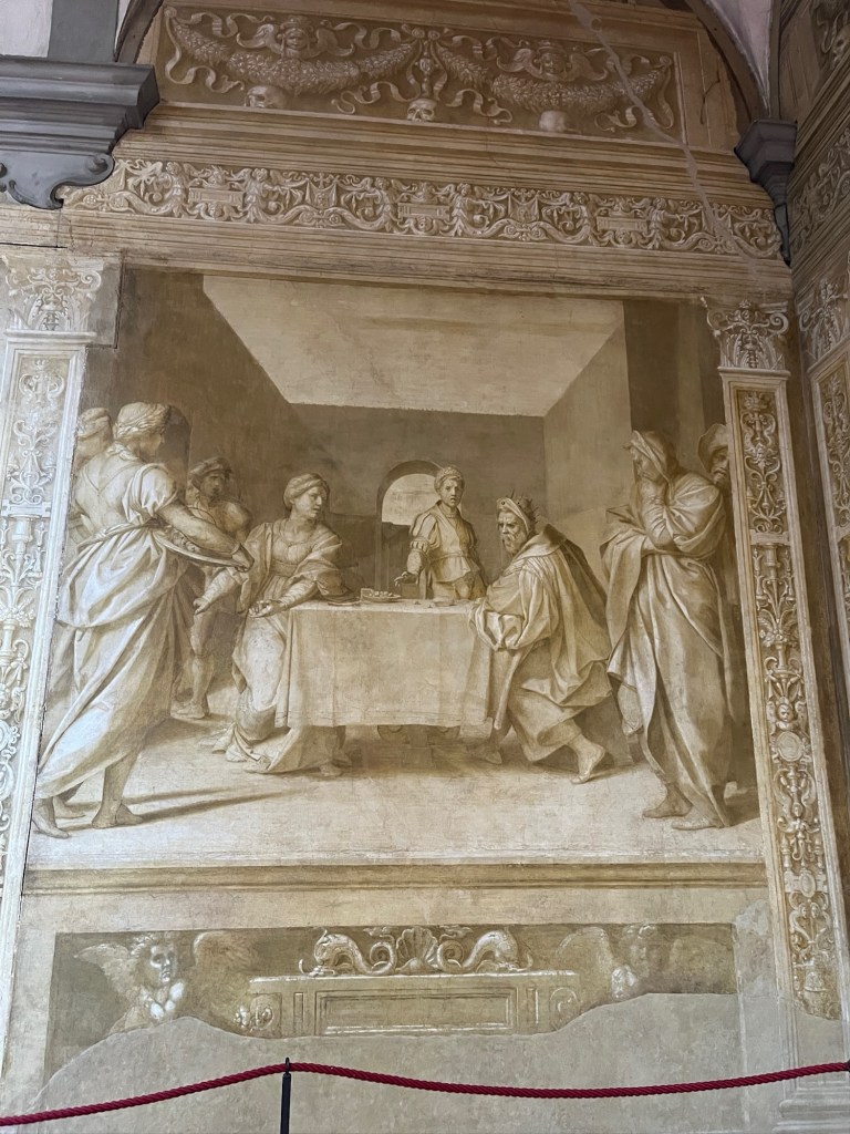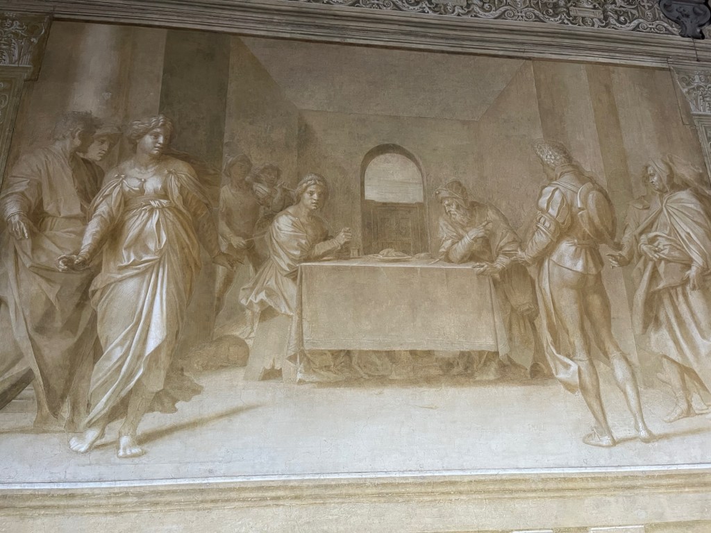 Two scenes were painted by Francesco di Cristofano, known as Franciabigio, who worked with del Sarto in their workshop. Del Sarto had been called to work in Rome and it was uncertain if he would return.