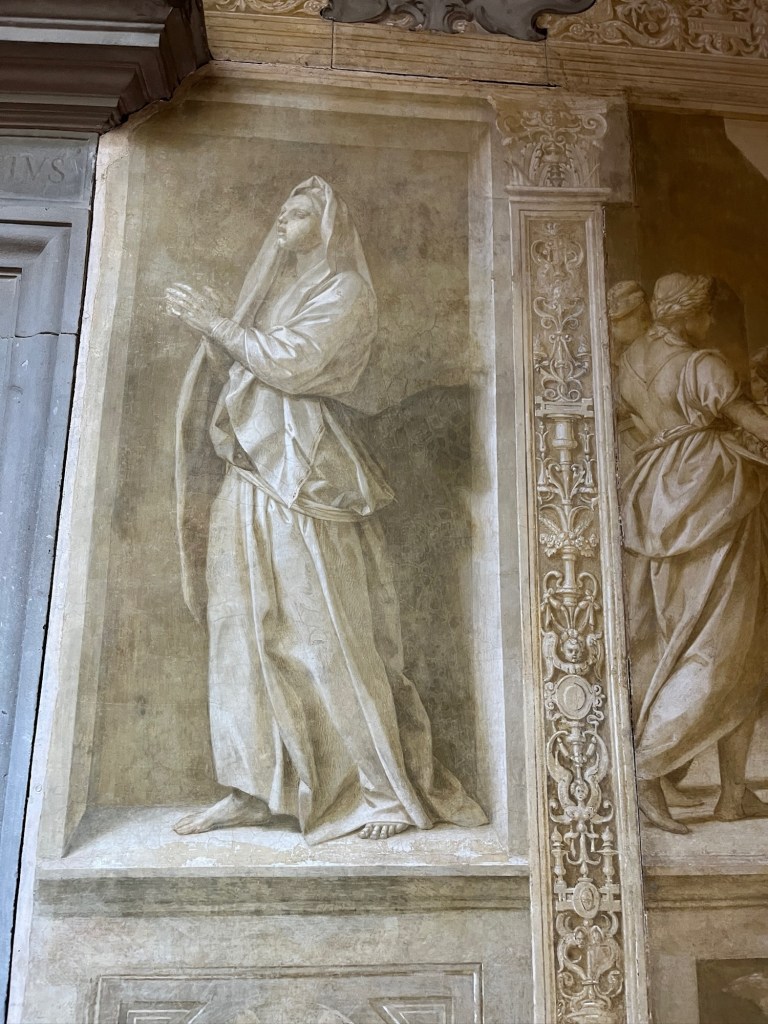 The first place was the Chiostro dello Scalzo. The chiostro (cloister) of the “compagnia del disciplinati di San Giovanni Battista” called Scalzo because they processed barefooted. A “compagnia” or company was a group of laymen who contributed to the defence of Roman Catholicism; ie it was a men’s club. The chiostro is near San Marco on this street next to the tram line which doesn’t appear promising for museum going.