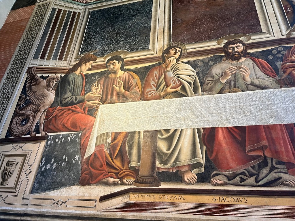 The fresco was done about 1447 when Florence last supper paintings had developed traditions and iconography to which Castagno innovated. (Leonardo’s innovative last supper was 1495-1498.)